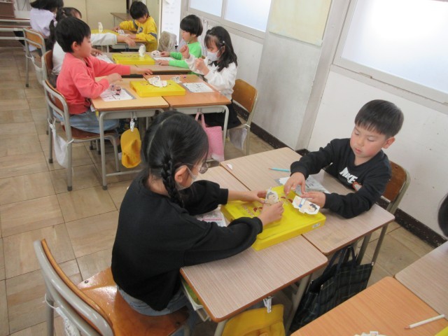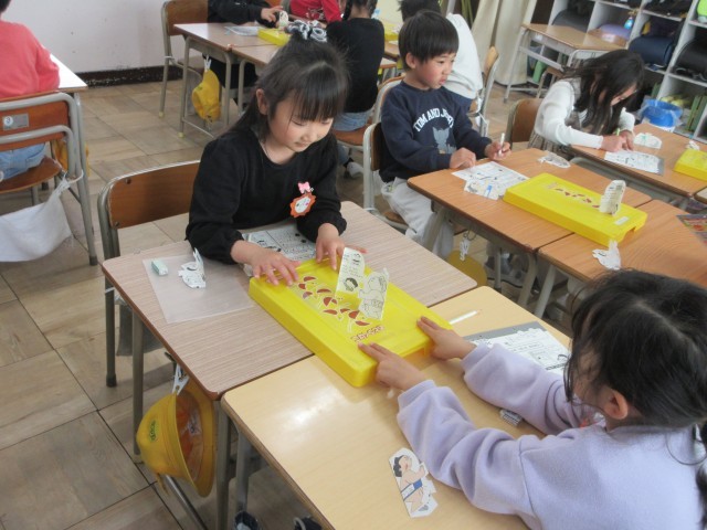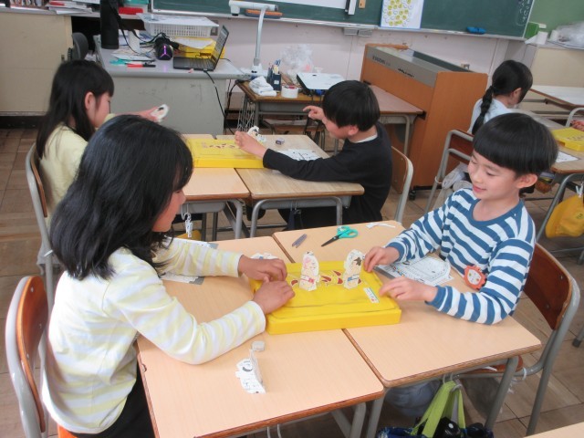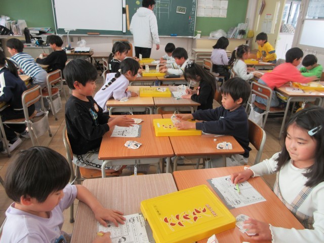 1年生の授業の様子です。生活科ではトントンずもうをしていました。手作りのお相撲さんを使って、トントンとやってみて楽しんでいます。