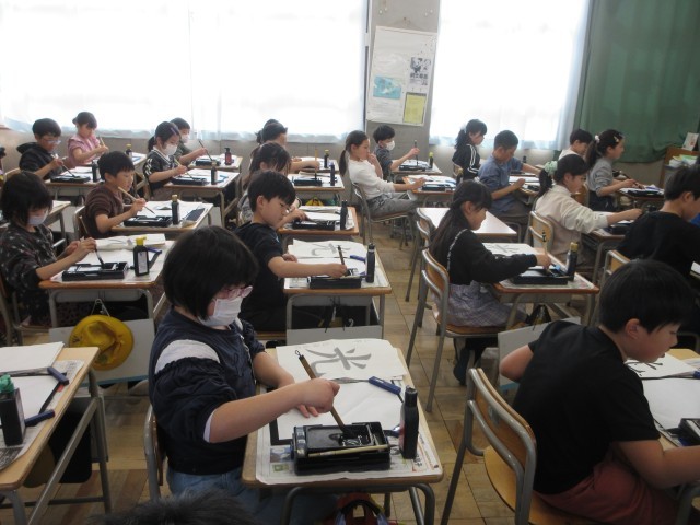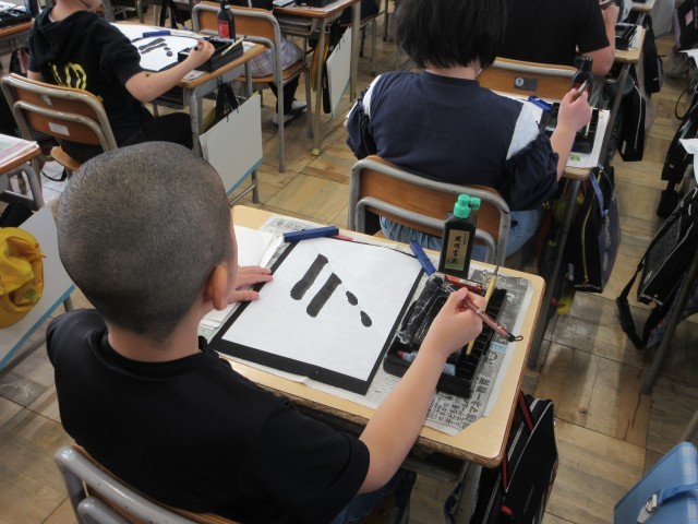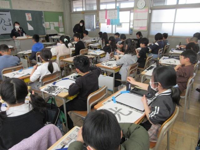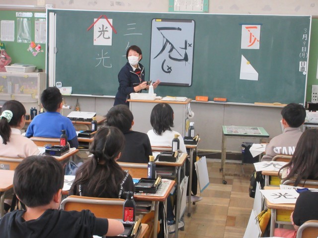 3年生の授業の様子です。書の時間に特別講師の吉岡先生と一緒に学んでいます。今回の文字は「光る」という文字です。姿勢や筆の持ち方の確認の後、始筆、縦画、横画 曲がり方、点、筆の動きなど大切なポイントを先生と一緒に練習します。教えていただいたことを気を付けて練習していきましょう。