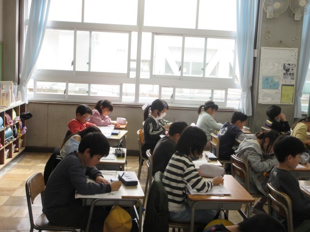 3年生の授業の様子です。書の時間の硬筆の一コマです。1年間の学習のまとめをしていました。1画1画ていねいにお手本を見ながら書いています。