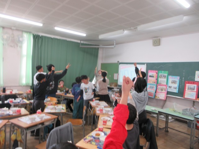 色々なクラスでおかわりのじゃんけんをしていました。今日はデザートもあって、大勢のみなさんがおかわりじゃんけんをしていました。来週あと1回給食があります。みんなでおいしくいただきましょう。