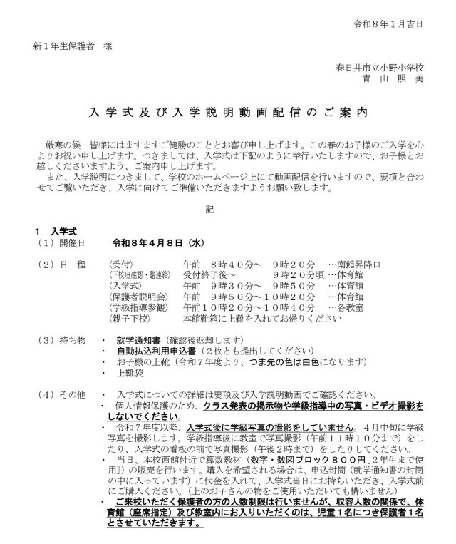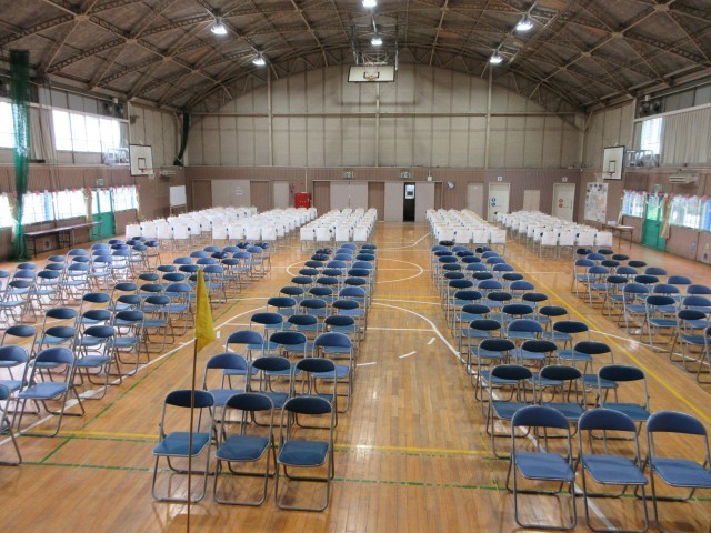 明日の入学式に向けて、職員が準備を行いました。体育館前の西館にクラス発表名簿を掲示します。クラスを確認後、受付をしていただき、本館昇降口にお進みください。靴を入れてから本館1階の廊下を通って、体育館にお進みください。体育館は指定席です。お子様のお名前が貼られた席にお座りください。詳細は入学式の案内や入学説明会要項をご確認ください。個人情報保護に関する配慮もお願いします。