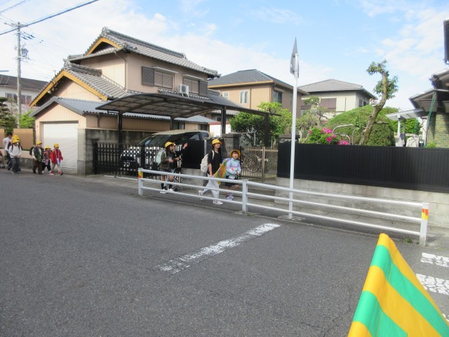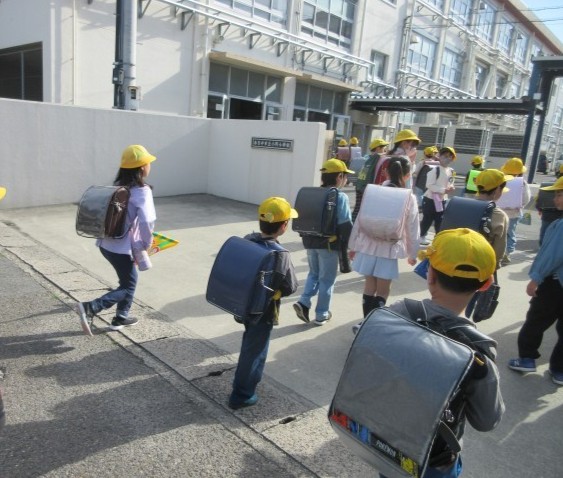4月13日(月)晴れの朝となりました。正門からの登校の様子です。新1年生も一緒に通学班で登校しています。正門で待っていると、元気にあいさつをしてくれる子がたくさんいました。とてもうれしいです。これからも班長さん、副班長さんと一緒に交通安全に気を付けて元気に登校してください。