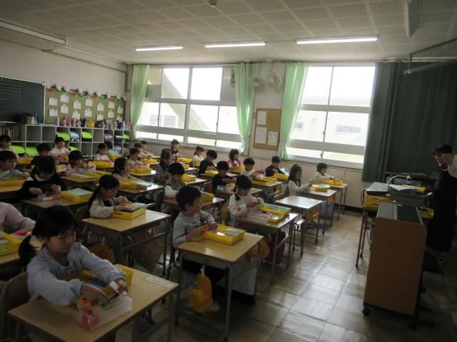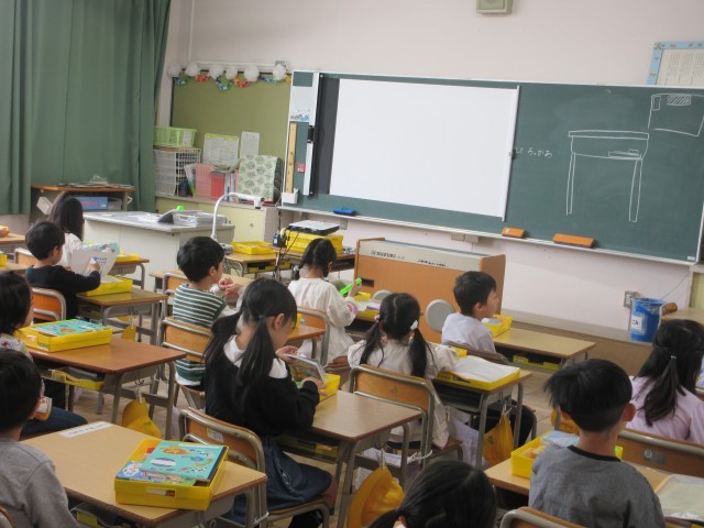 お道具箱の整理整とんをしていました。1年生はどんなふうに片付けたらいいのか先生のお話を聴きながら、お道具箱をきれいにしまっていましたね。これからも、お道具箱を整理整とんしてくださいね。