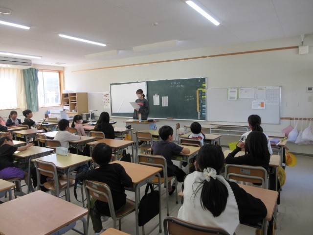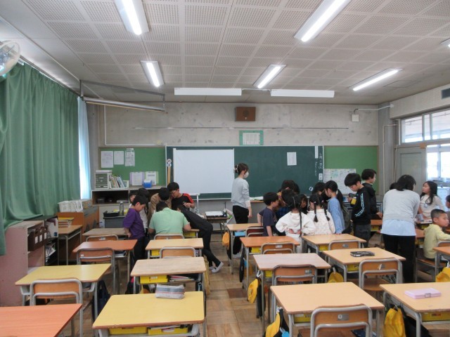 16日の2時間目に、通学団会議を行いました。班長が1年生を迎えに行き、それぞれの通学班の集合場所に集まりました。担当の先生から集合時間や並び方などの再確認を行いました。また、登校時に使用する班旗の交換も行いました。