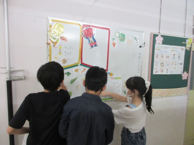 保健室前に給食に関する掲示板があります。毎日の給食の献立を、栄養ごとに赤、緑、黄色にわけ、みんなに紹介してくれます。給食委員のみなさん、ありがとうございます。これからもよろしくお願いします。