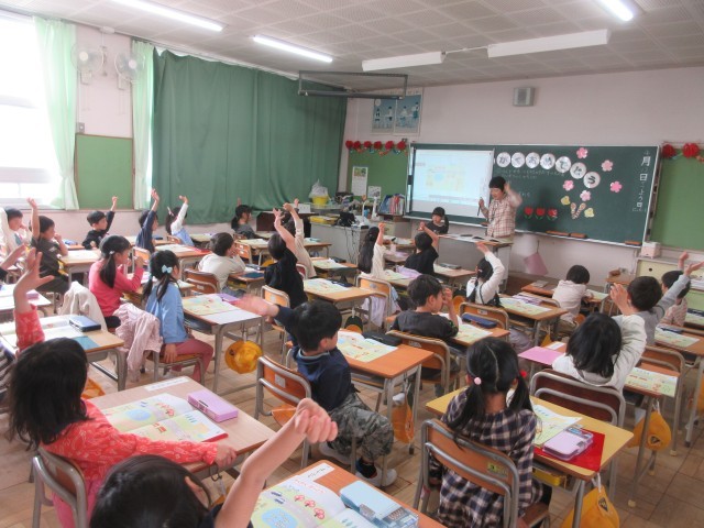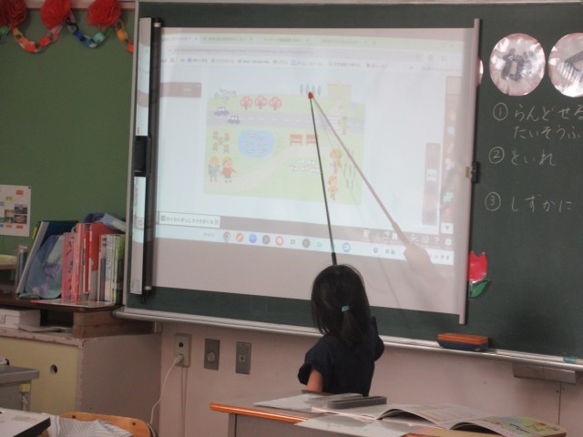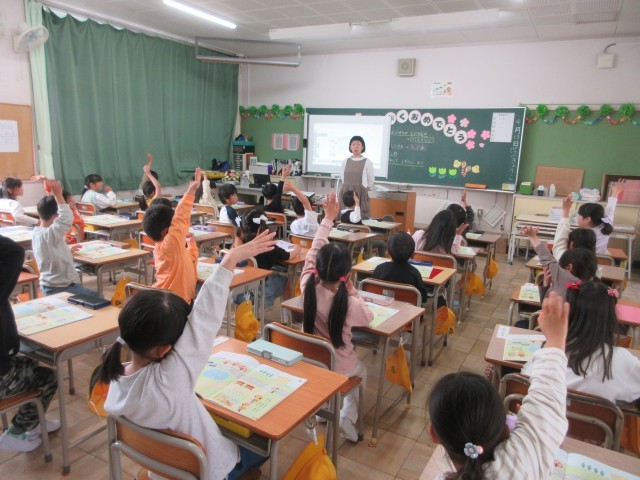 1年生の授業の様子です。算数では「わくわくがっこう」の学習をしていました。教科書の絵から見つけたものを発表していましたね。細かいところまでよく見て、大勢の子どもたちが発言をしていました。やる気いっぱいです。