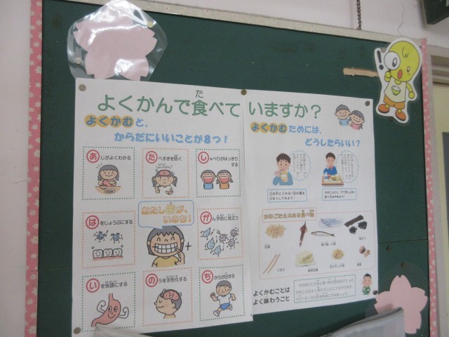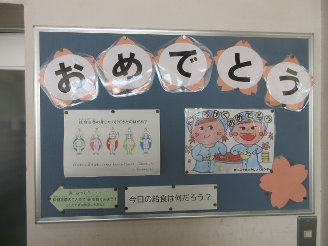 1年生のみなさん、入学おめでとうございます。みなさんがはじめて食べる給食は、1番人気の「カレーシチュー」。給食の献立は、ごはんやパンなどの主食と牛乳、おかずを組み合わせて考えています。これからもしっかり食べて、元気に大きく成長できるようにしましょう。