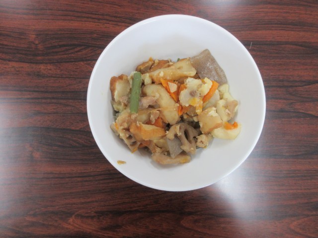今日の給食一言話は「がめ煮」です。がめ煮は福岡県で昔から食べられていた郷土料理です。福岡県の方言で「寄せ集める」という意味の「がめくりこむ」から名前がついたそうです。「筑前煮」とも呼ばれ、正月やお祭りなどのお祝いごとの日に食べられます。具沢山の煮物で野菜をたくさん食べることができるので、体の栄養バランスを整えるのにぴったりの料理です。