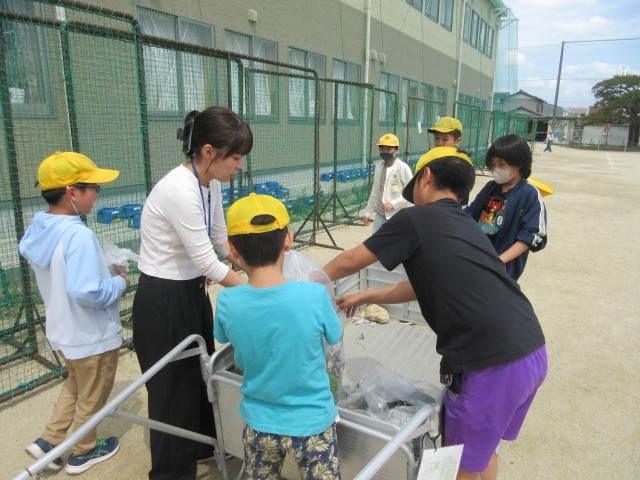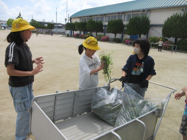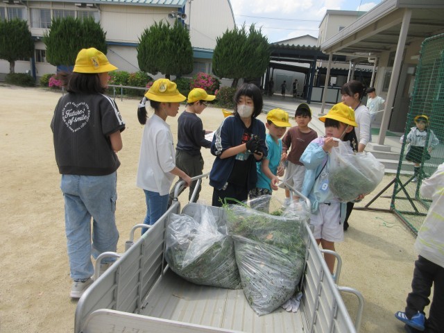 4月20日(月)掃除の時間の一コマです。外掃除では環境委員のみなさんが、みんなが集めた雑草や落ち葉などを集め、運んでくれます。南館前まで来てくれて、2年生の外掃除のみんなが集めた雑草を持って行ってくれました。委員会のお兄さん、お姉さん、ありがとう。