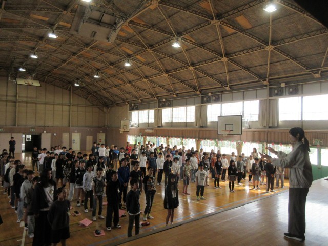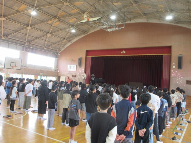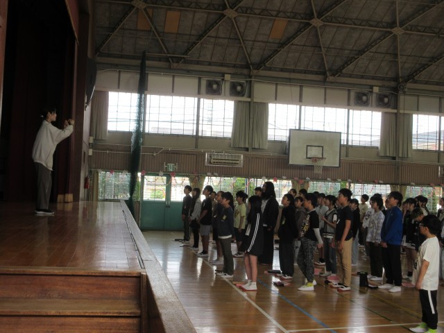 4月22日(水)6年生は体育館で校歌の練習をしました。口の開け方、発声の仕方、姿勢について先生のお話のあと、早速練習をしました。1年生を迎える会で、1年生に歌ってあげる校歌です。本番では隣にかわいらしい1年生が、みなさんの歌声を聴いていますよ。1年生のために、6年生の心を込めた素敵な校歌のお手本をお願いします。