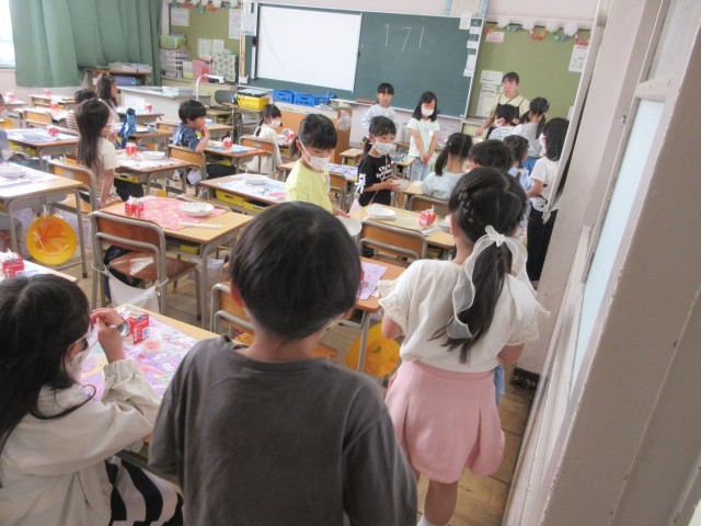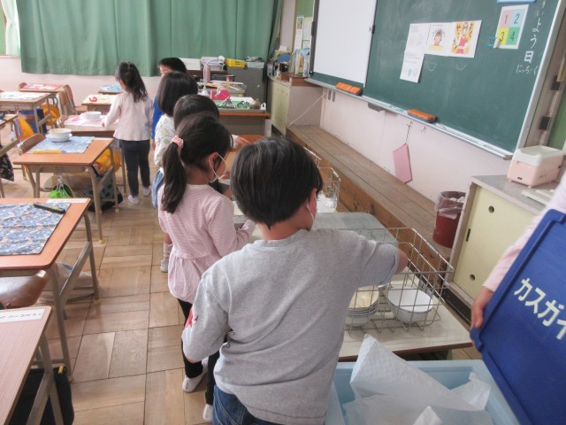 4月22日(水)給食の一コマです。1年生は給食2日目ですね。今日は後片付けの様子を紹介します。自分の分は自分で片付けます。順番を守って上手にできていましたね。
