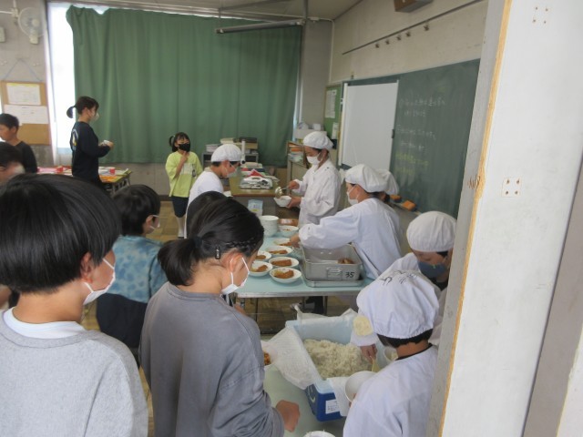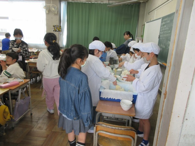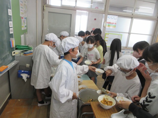 給食の一コマです。北館の様子を紹介します。3年生、4年生は上手に当番のみなさんが準備をして、みんなが協力をしていました。うまく配膳ができると、ゆっくり食べることができますね。更に楽しい給食の時間を過ごすことができそうです。