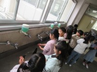 1年生は外から帰ってくると、教室に入る前に手洗いをしています。1年生の子どもた...