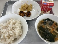 今日の給食は、麦ごはん、牛乳、中華五目スープ、揚げしゅうまい、もやしのナムルです...