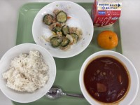 今日の給食は、麦ごはん、牛乳、ハッシュドビーフ、ツナサラダ、冷凍みかんです。ツナ...