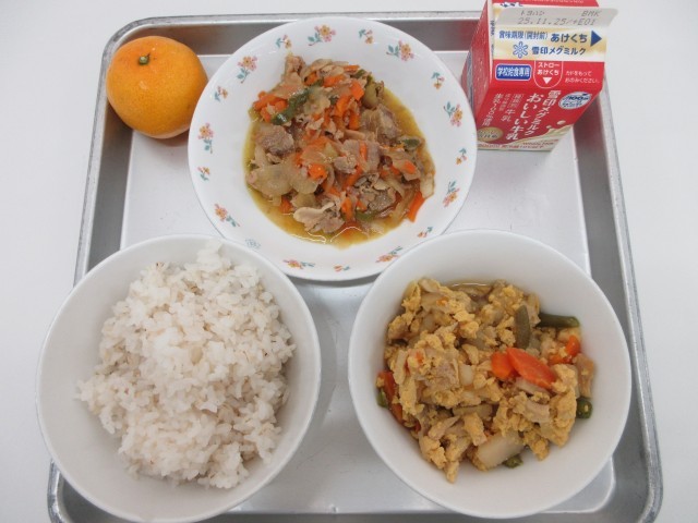 今日の給食は、麦ごはん、牛乳、高野豆腐の卵とじ、いろどりいため、みかんです。みか...