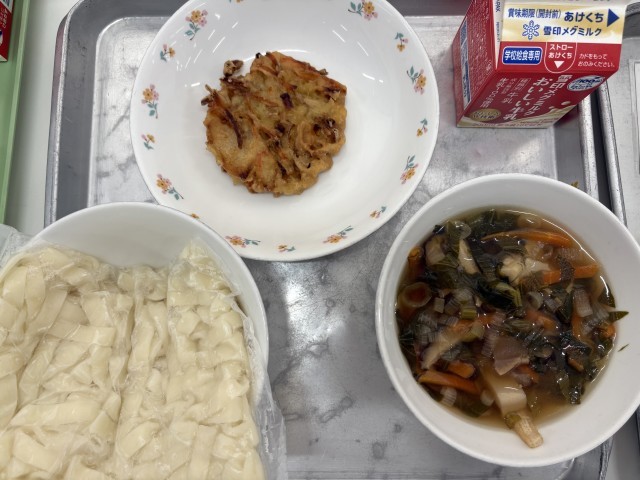 今日の給食は、きしめん、牛乳、きしめんの汁、かきあげです。きしめんは平たい形が特...