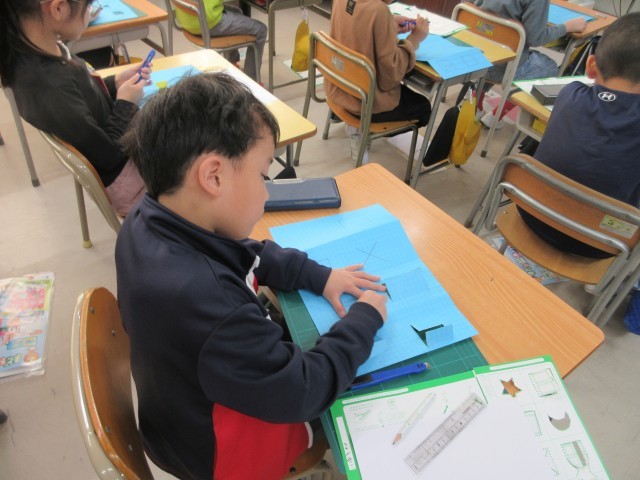2年生の授業の様子です。図工では「まどをあけたら」の学習をしています。カッター...