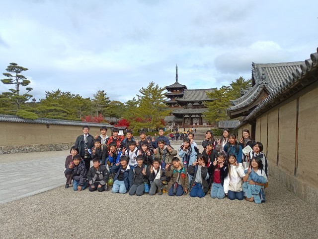 集合写真撮影後、五重塔や金堂の中、宝物殿などを見学しました。