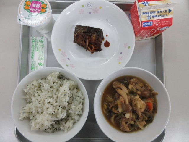 今日の給食は、愛知の大根葉ごはん、牛乳、ひきずり、さばのみそ煮、愛知のみかんゼリ...