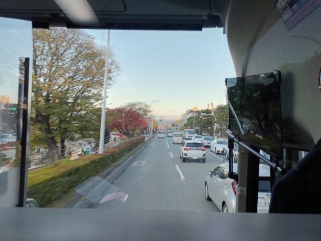 法隆寺から次の見学地の東大寺まで、バスに乗りながらの移動です。ガイドさんが車窓...