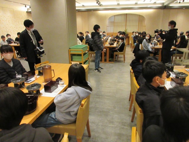 修学旅行の夕食の一こまです。ご飯のおひつが空っぽになりました。おかわりをいっぱ...