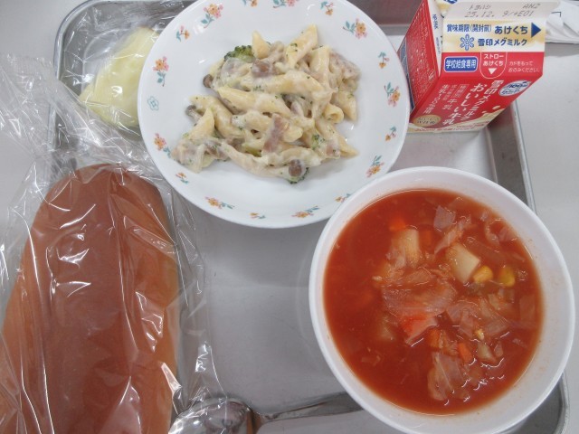 今日の給食は、くろロールパン、牛乳、ミネストローネ、ペンネのクリームソース、りん...