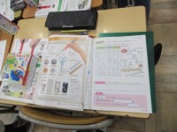 3年生理科の時間です。班活動です。机の上を見たら、やる気がわかりました。集中し...
