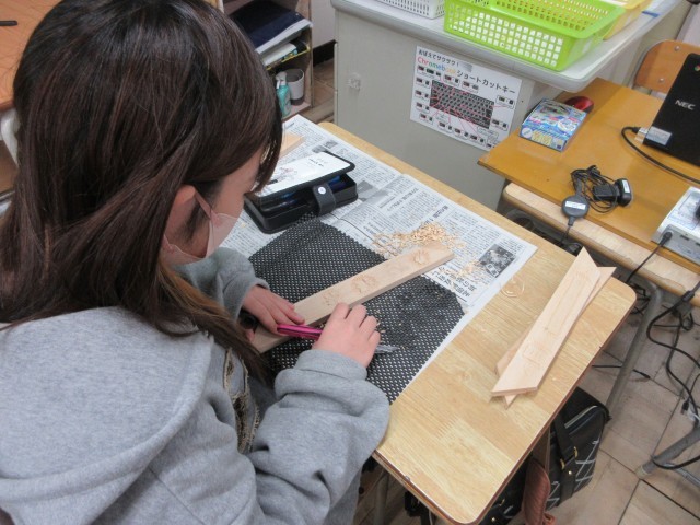6年生は卒業制作を始めています。色紙を入れるフレームを作っています。木の枠を色...
