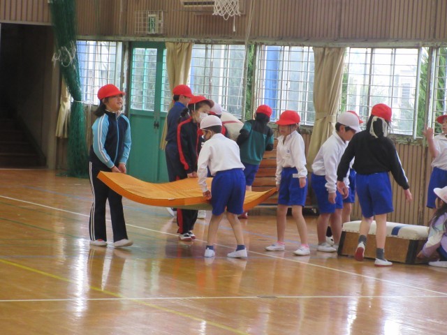 2年生の授業の様子です。体育館では跳び箱の練習をしています。たくさんの道具を使...