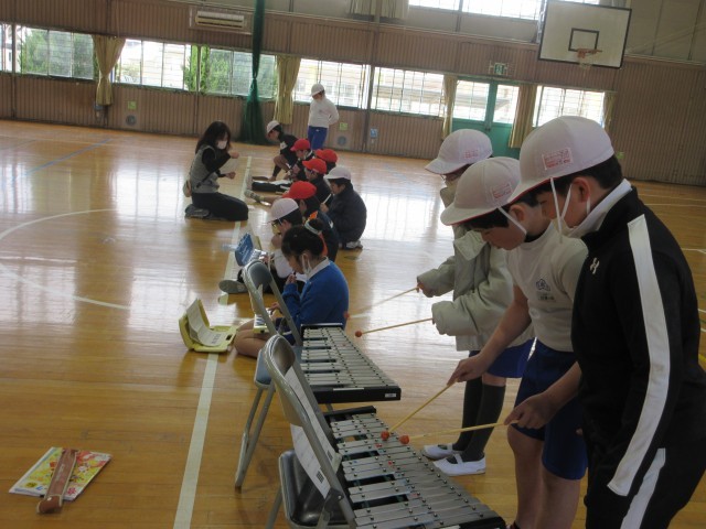 卒業生を送る会に向けて、5年生は体育館で楽器を使って試し練習をしていました。い...