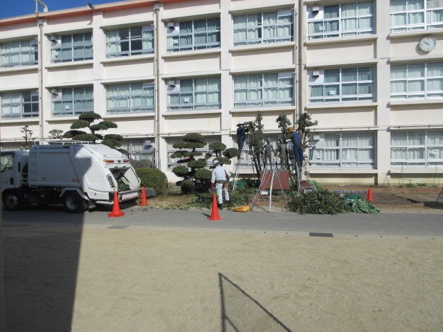 造園会社の方たちが、校庭の樹木の手入れに来ています。枯れて危険な木はないかどう...