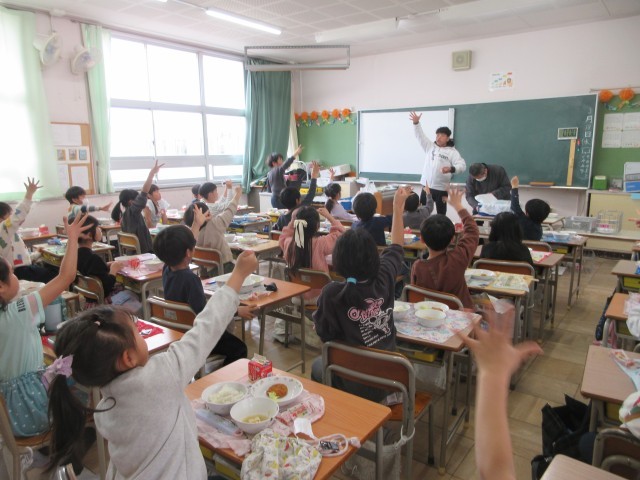 色々なクラスでおかわりのじゃんけんをしていました。今日はデザートもあって、大勢の...
