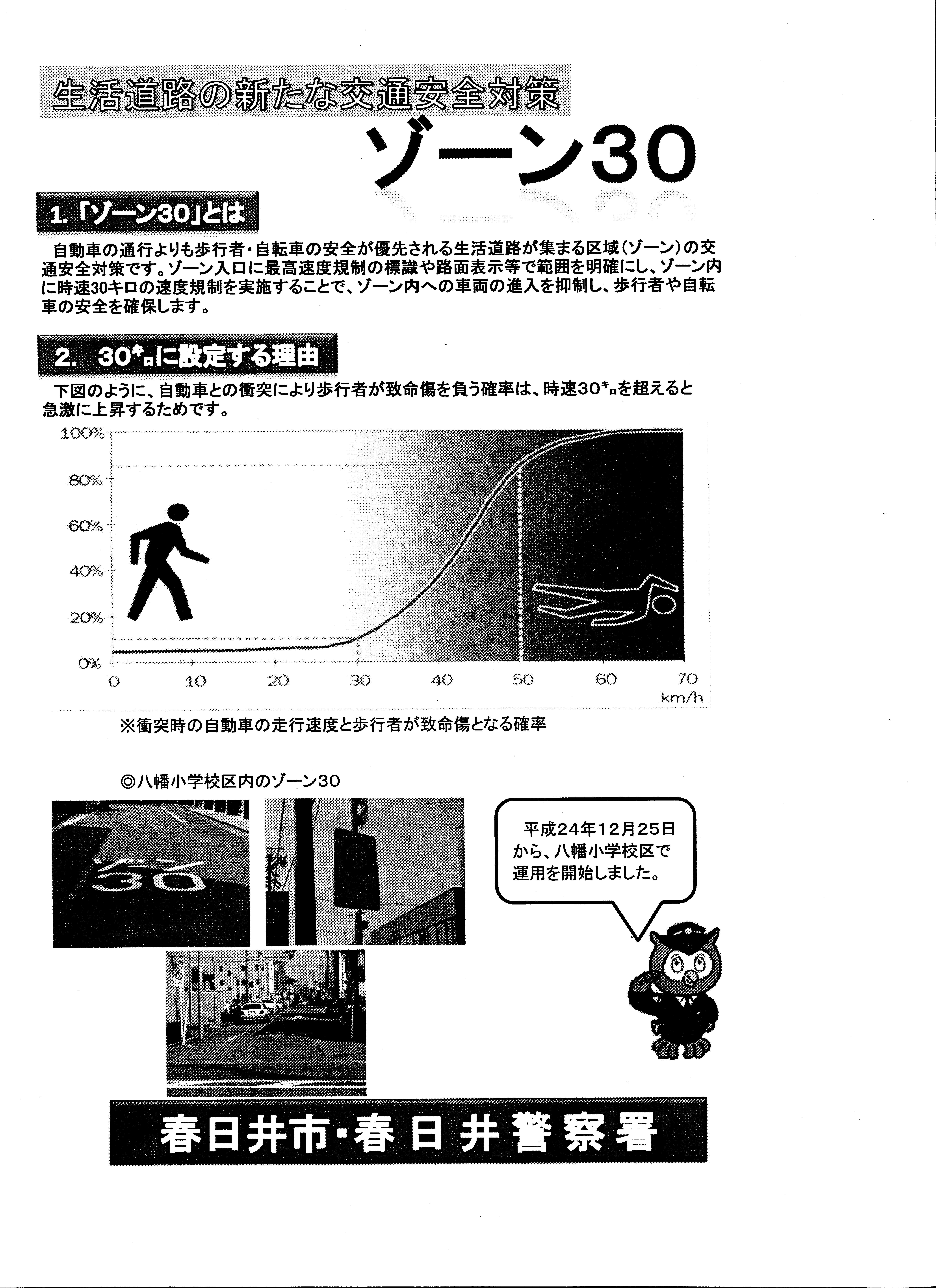 現在、八幡小校区内の新たな交通安全対策として「ゾーン30」が設定されています。ゾーン30とは時速30キロの速度制限を実施することで、車両の進入を抑制し、歩行者や自転車の安全を確保するものです。