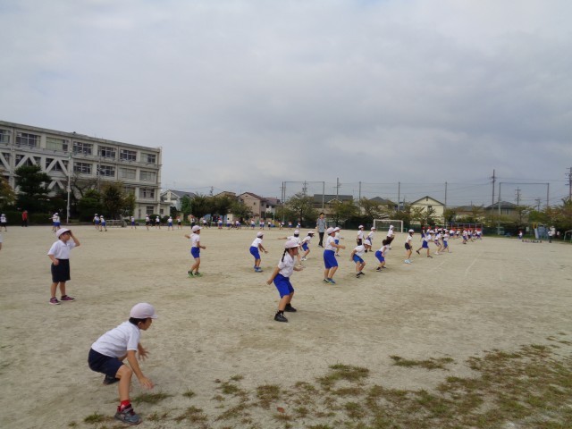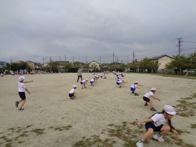 10月7日(火)3・4年生合同の体育で、運動会の音遊の練習をしました。初めて運動場で合同で曲に合わせて踊りました。3年生はトラックの南側で踊ります。応援よろしくお願いいたします。