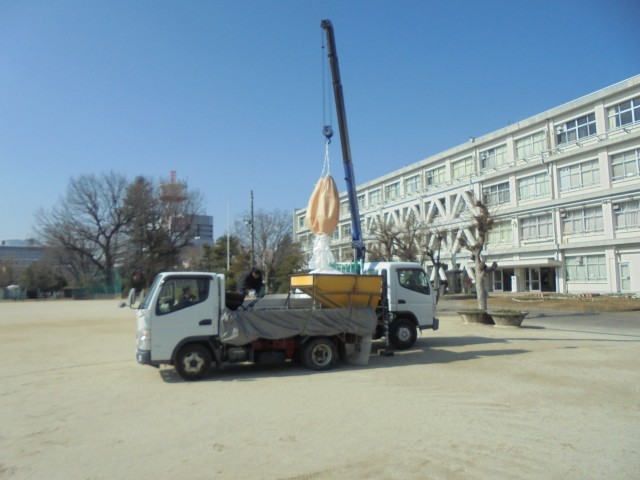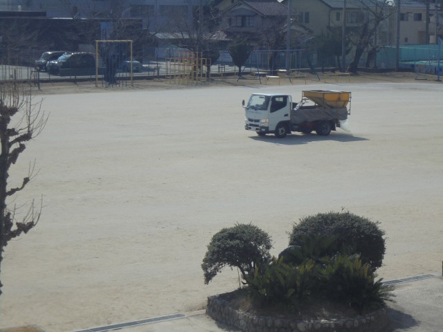 2月12日(木) 快適なグランド環境を維持するために、運動場に塩化カルシウムを散布していただきました。砂埃の飛散防止や凍結防止などの効果があります。