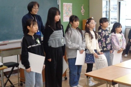 1月7日(水)3学期始業式の様子です。始業式は児童会の挨拶から始まり、校長先生のお話を聴き、校歌を斉唱しました。校長先生からは、3学期は次の学年への準備といわれる0学期なので、「今さら」と思わず、「今から」「今なら」と思って目標を立てましょうというお話でした。始業式の後は、席上揮毫大会の表彰と転入生の紹介がありました。