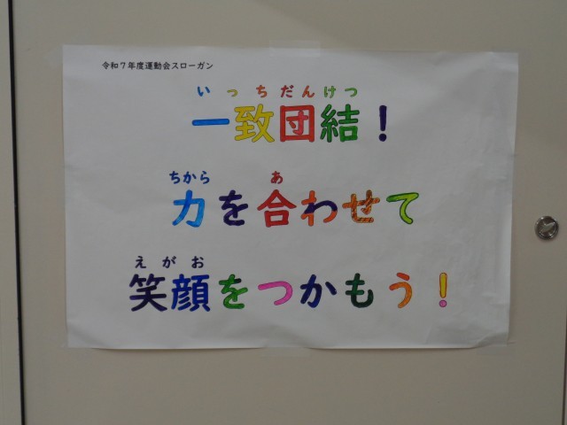 運動会のスローガンが決まりました。今年のスローガンは「一致団結! 力を合わせて 笑顔をつかもう!」です。八幡っ子の皆さん、スローガンに向かって運動会の思い出を自分で作りましょう!