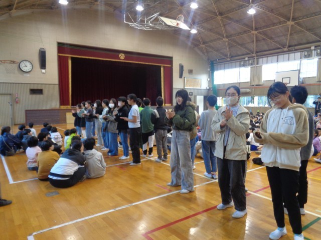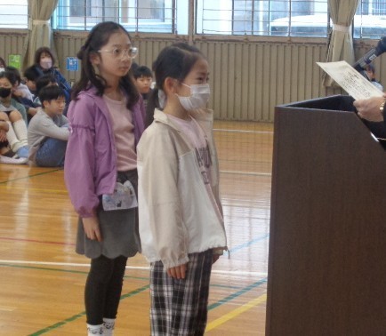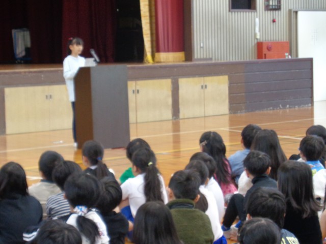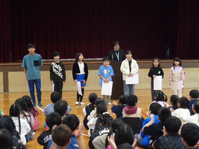 11月17日(月)集会の様子です。集会では、読書感想文コンクール・尾張研究会書写コンクールの表彰伝達と校長先生のお話、委員会からの連絡がありました。