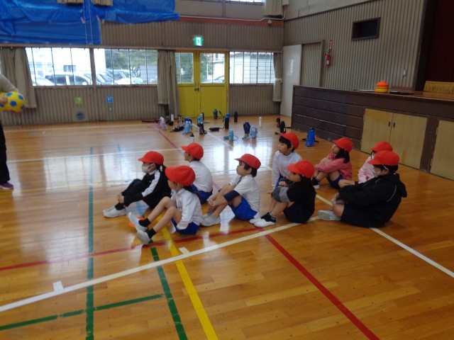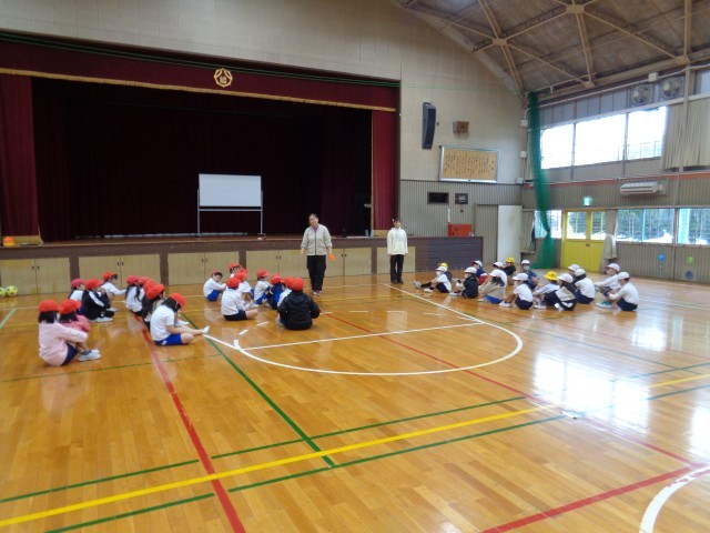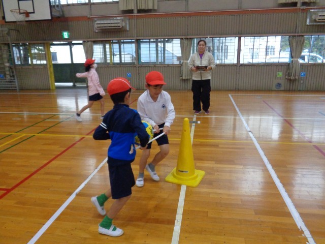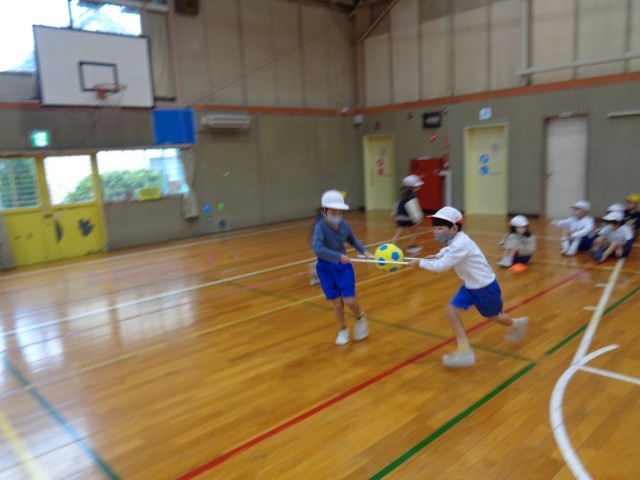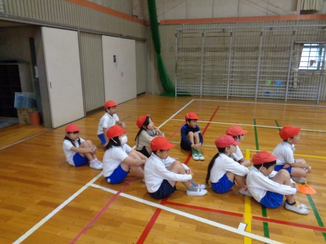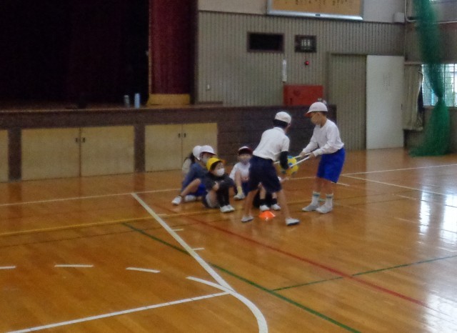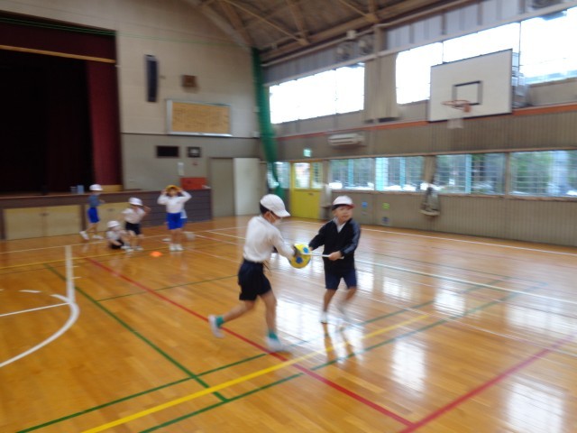10月7日(火)1・2年生合同の体育で、運動会の競遊の練習をしました。初めての運動会に向けて頑張っている1年生のお兄さん・お姉さんとして頑張っています。