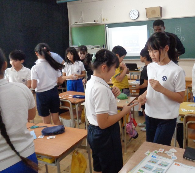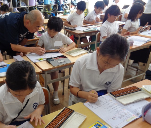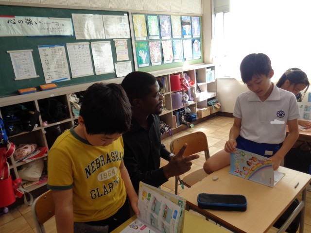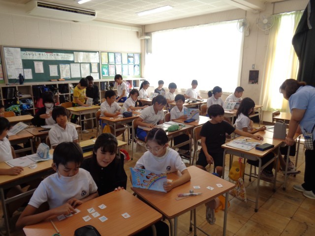 10月17日(金)1組は算数、2組は外国語活動の様子です。算数はそろばんを使って計算をしました。そろばんの使い方に悪戦苦闘しながら計算をしました。外国語活動はALTと外国語の先生と一緒に「文房具セットをたずねあおう」という学習をしました。英語で何を持っているか友だちに聞きあいました。