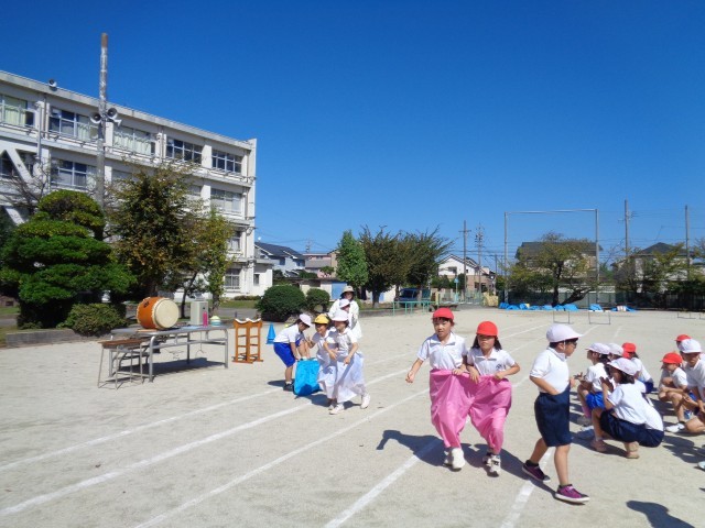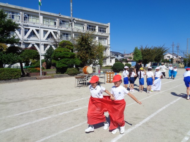 10月17日(金)3・4年生は合同で運動会の競遊「デカパン競争」の練習をしました。二人で息を合わせて走ります。応援よろしくお願いします。