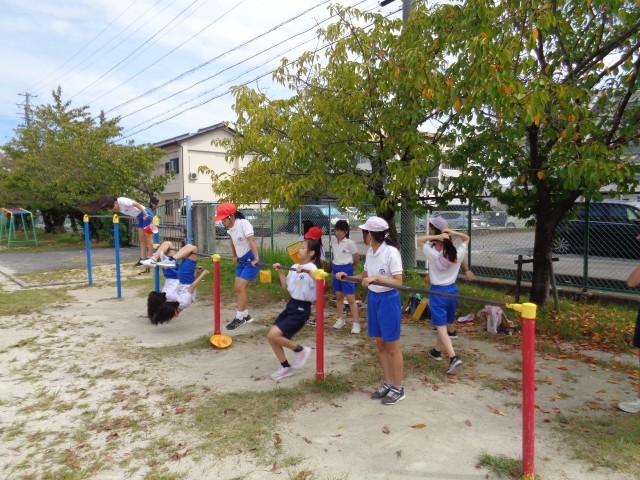 10月2日(木)鉄棒と走り幅跳びをしました。鉄棒では自分のできる技を披露しました。走り幅跳びではタイミングをつかんでより遠くに跳べるように何度も挑戦しました。