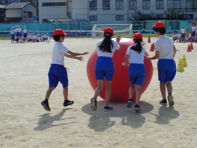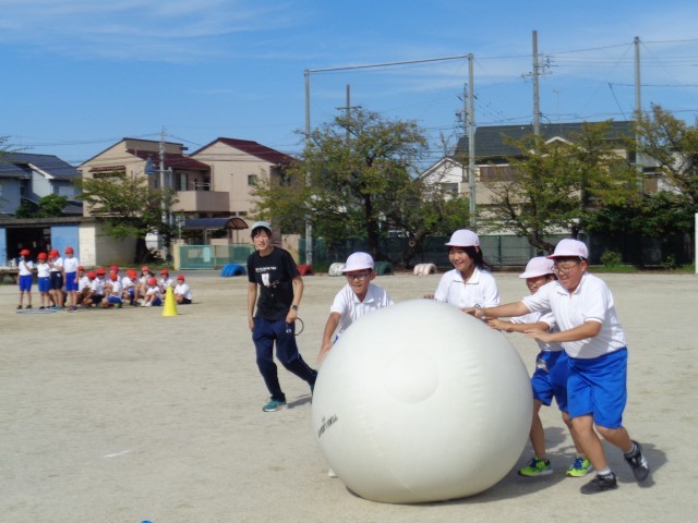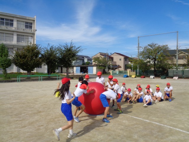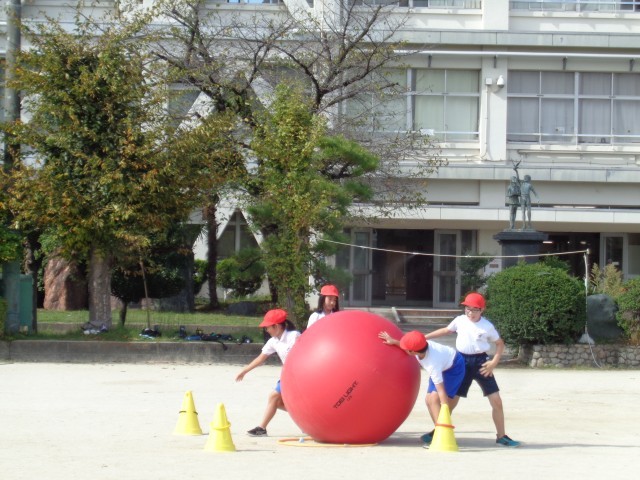 10月8日(水)5・6年生合同で体育をしました。運動会で行う競遊の練習をしました。初めて行う競技に戸惑いながらも、友達と八幡の「た」助け合うことができました。