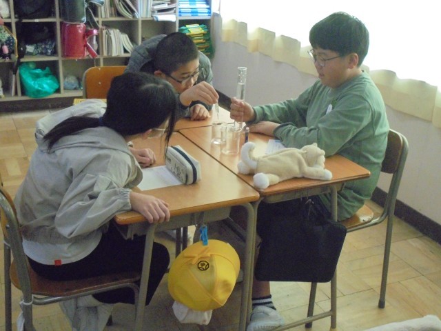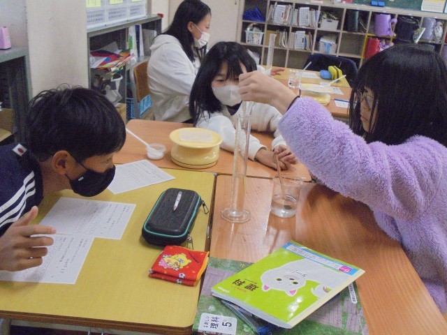 11月12日(水) 理科の授業で「もののとけ方」の学習をしました。水の量を変えると、ミョウバンのとけ方にどのような違いが出るのかしらべました。