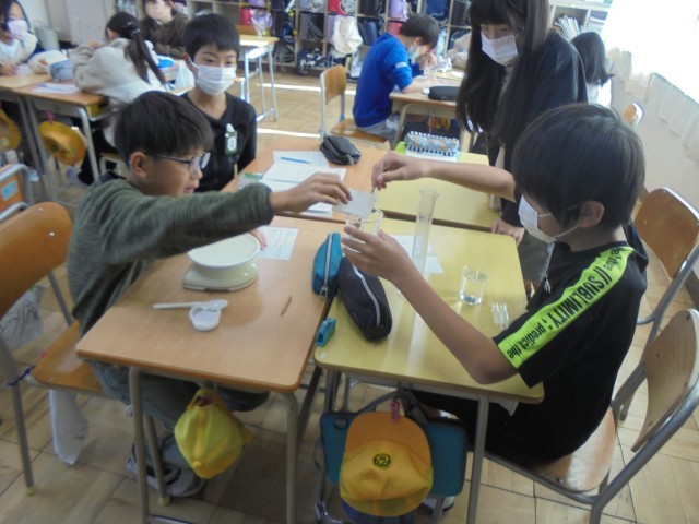 10月29日 理科の授業で「物のとけ方」を学習しました。班で協力して、食塩やミョウバンが水にどのくらいとけるのか調べることができました。