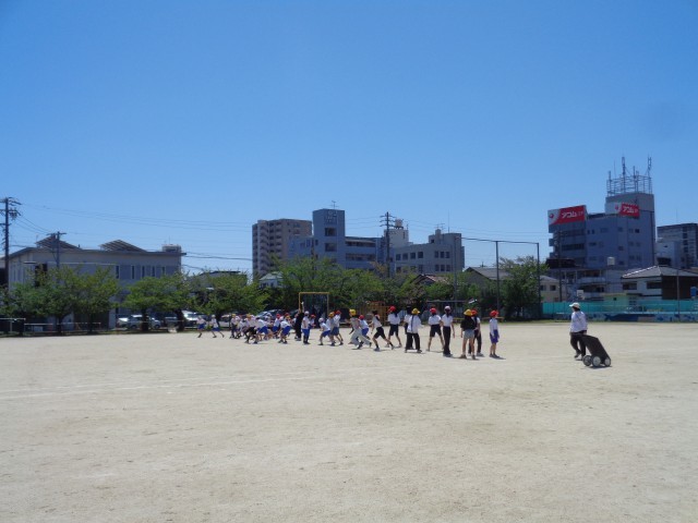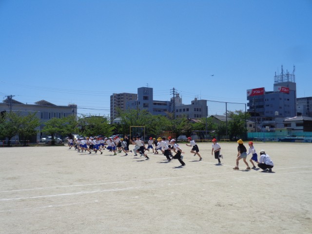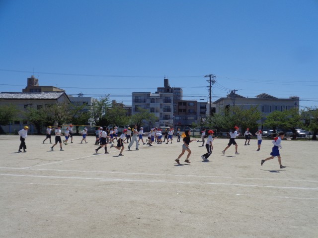 4月16日(木)体育で「たこ・たい」をしている様子です。5年生は1・2組合同で体育をしています。今年度より体育専科の教師が増え、専門的に体育の学習を進めていくこととなりました。どうぞよろしくお願いいたします。