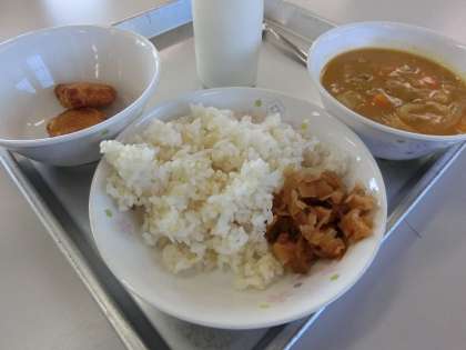 10月9日(火)の献立は『発芽玄米ごはん』『牛乳』『えがおのカレーシチュー』『たこのナゲット』『福神漬け』です。