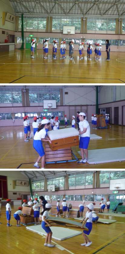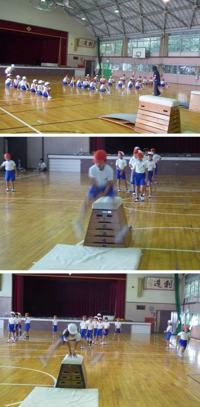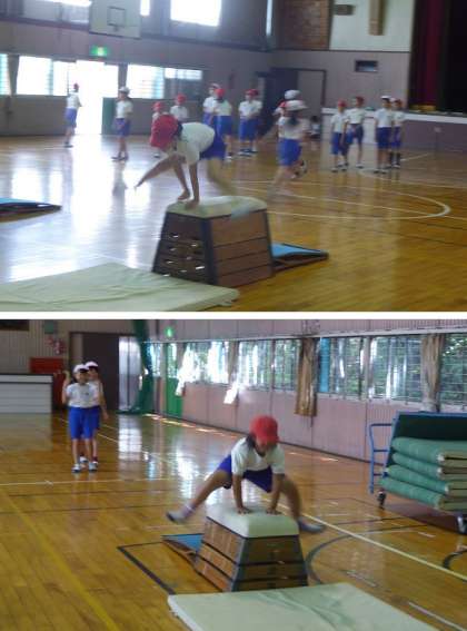 体育館で、跳び箱の練習をがんばっていました。自分たちできれいに並べて、だんだん高い跳び箱にチャレンジをしていました。とてもきれいなフォームで跳べていましたよ。