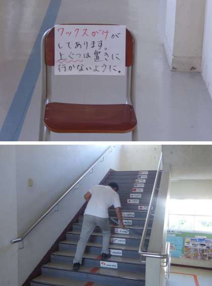 今日はみんなで水拭きをした廊下や階段を先生方がきれいにワックスをかけてくださいました。とてもきれいになりましたよ。ありがとうございました。